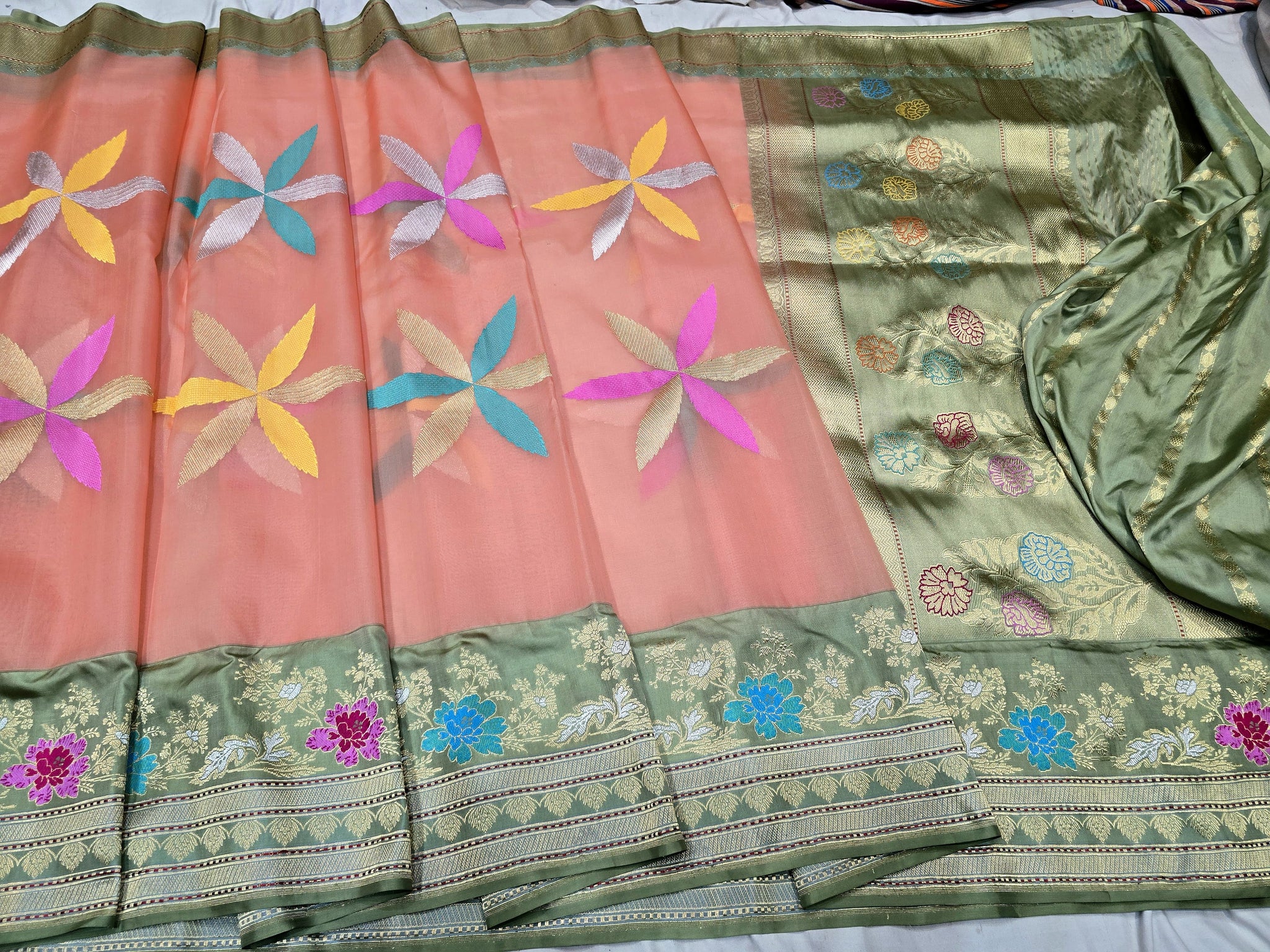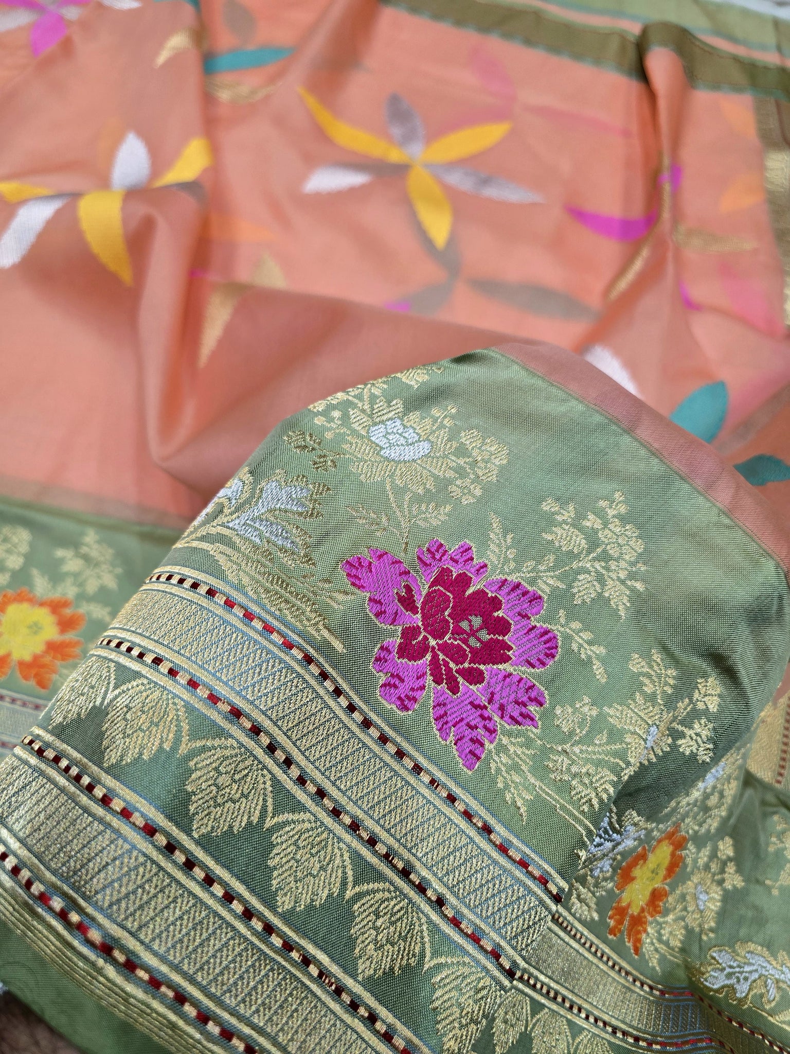 Contemporary iktara kora silk jamdani saree with kadhiyal tilfi katan contrast border with Parsi gara inspiration kadhva weaves , very intricately woven kadhva weaves.