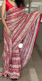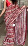 Premium handloom smooth georgette saree with very premium tissue foil weaving zari lines over all and digital print are giving outstanding look to entire saree … hi lighting with sabyasachi Scallop borders … with contrast blouse with zari florals and sabyasachi border as