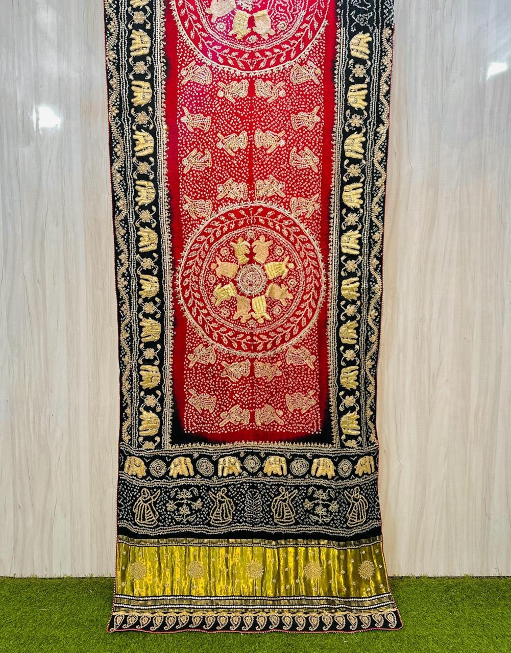 This pure gajji silk bandhani saree features intricate heavy embroidery, showcasing original handwork. The use of 100% silk ensures a luxurious drape and comfort, ideal for wedding celebrations. The craftsmanship reflects significant cultural heritage, making it a timeless addition to ceremonial attire.